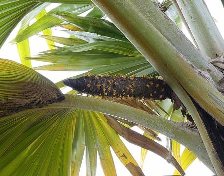 Hanpalmen bærer en blomst i ca. 7-8 måneder hvorefter den visner og falder af. Hunpalmen bliver ved med at producere nødder og kan have op til 54 nødder af gangen på sig.