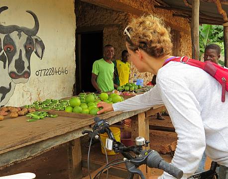 I inviteres indenfor i en af de røde lerhytter, der alle har deres egen lille gårdhave med banantræer og I oplever også, hvor der laves trækul (den lokale brændsel). Videre gennem den lille landsby til ”torvet”, hvor landsbyens beboere mødes og sludrer og videre til skolen. Husk Jambo betyder goddag, men det skal I nok få lært