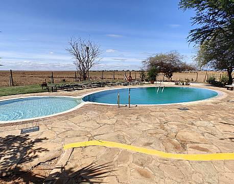 Safari er tidligt op og tidligt i seng. De mange oplevelser på de ujævne veje sluger noget energi. Det er derfor vigtigt at få koblet fra, når muligheden byder sig. Efter morgenmaden gik vi derfor til swimmingpoolen og lagde os. Solen var stærk så vi rykkede stolene ind i skyggen. Fra vores solsenge kunne vi nyde vandbukke og elefanter på savannen og rovfugle på himlen. Ind imellem tog vi lige en svalende dukkert. Med fornyet energi var vi nu klar til frokost.
