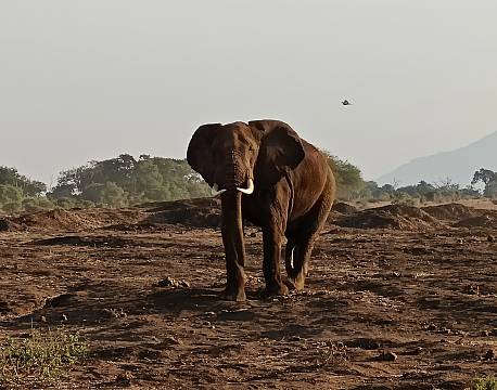 Kort efter fik vi øje på en flok elefanter, der var på vej væk fra os. De gik på en lang række. Vi kørte om på den anden side af dem, så vi så dem forfra. De standsede op ved et vandhul for at drikke og for at sprøjte mudder på sig som hudbeskyttelse. Efter nogen tid kom en stor hanelefant gående i horisonten henimod gruppen af hunner og unger. De hilste kortvarigt på hinanden og fortsatte så hver til sit.