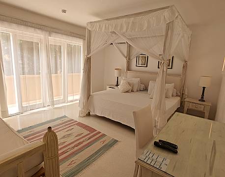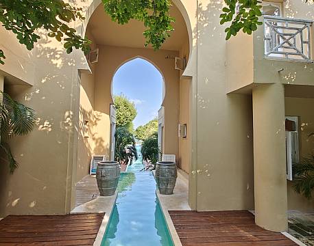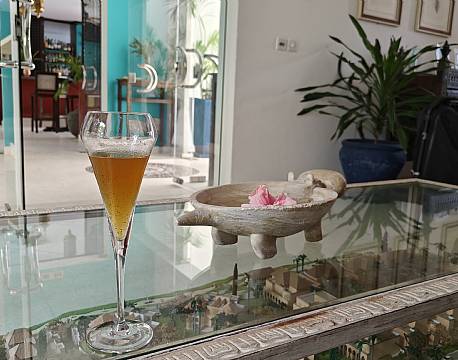 Vi afleverede vores pas til receptionen og udfyldte et skema, mens vi nød den kølige velkomstdrink. Da receptionisten kom med nøglen, tog vi lige en ekstra slurk af vores drink. Vi fik nemlig at vide at vi var blevet opgraderet fra De Luxe værelse på 146 m2 til en penthouse på 279 m2.