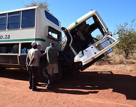 Som et kuriosum kan nævnes, at minibussen i øvrigt punkterede på den videre færd, og ligeledes var ved at løbe tør for kølervæske, så vi måtte samle kildevand sammen blandt de rejsende og hælde på bilen. Trods alle gode kræfter missede vi da også flyet i Johannesburg.