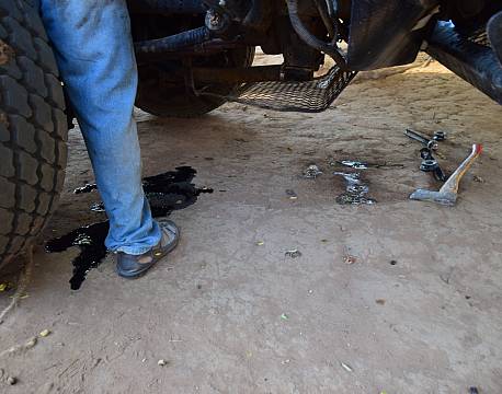 I Botswana er afstandene store, og vi havde kørt rigtig langt på vores Botswana Adventure tur. Da hjemturen skulle starte, viste det sig at olieslangen ikke havde klaret strabadserne og var sprunget læk. Hvad gør man, når man ikke lige har en ekstra olieslange ved hånden?