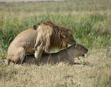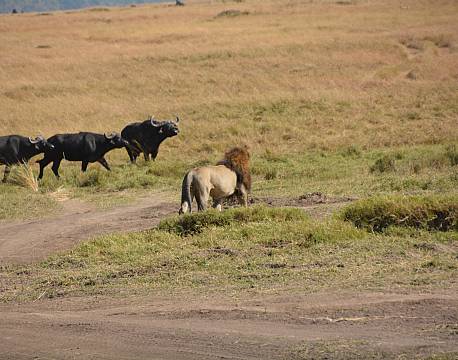 ”De store oplevelser stod i kø i dag i Masai Mara. Dagen startede med optræk til voldelig konflikt. En hanløve havde sneget sig ind på fremmed territorium og rent fysisk kastet sin kærlighed på en fremmed hunløve. Det opdagede to hanløver fra Marsh Pride – kendt fra TV-serien ”De Store Katte” – så de fik travlt med at jage ham på porten. Vi sad midt i det højspændte drama på første parket, og den jagede blev kun reddet fra korporlig afstraffelse, fordi en flok bøfler kom imellem og således forhindrede de to brødre i at indhente den jagede.