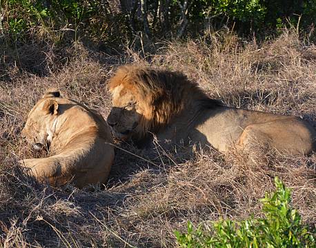 ”I løbet af gamedrivet så vi rigtig mange dyr. Her skal kun de vigtigste oplevelser nævnes. En gepard med tre unger, en kæmpe bøffelflok som nærmest omringede bilen, mange elefanter tæt på som var i gang med at spise tykke akaciegrene, giraffer, to løvepar som var elskovssyge, så hannen nøje fulgte hunnens bevægelser. Lagde hun sig, lagde han sig etc.