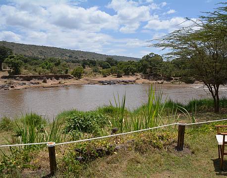”Efter rundvisning på campen – en tur bag kulisserne – nød vi frokosten i haven med udsigt til flodheste, impalaer og giraffer. Desværre kom ingen af dem til floden for at drikke. Troede ellers ad flere omgange, at nu ville et par af girafferne gå ned og drikke, men der var åbenbart noget, der forstyrrede dem. Måske de mange flodheste som lå både på flodbredden og ude i floden. Alligevel et fantastisk sceneri og hyggeligt med flodhestenes grynten som ”baggrundsmusik”.”