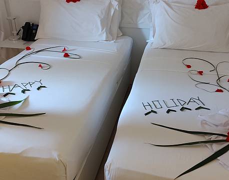 Efter en times tid blev vi hentet. Vores værelse var klar. En smukt dekoreret seng bød os velkommen i et fint værelse med en lille terrasse foran.”