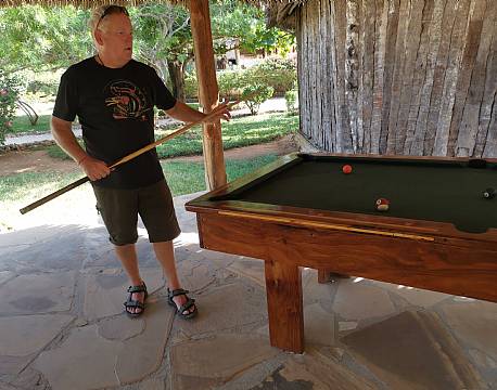 ”Fik et glas koldt at drikke og gik derefter hen for at afvikle revanchedyster ved både billard og bordtennisbord. Da tusmørket satte ind, måtte vi afbryde spillet, for nu kom myggene frem og de var i humør til at stikke.