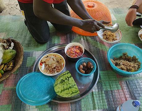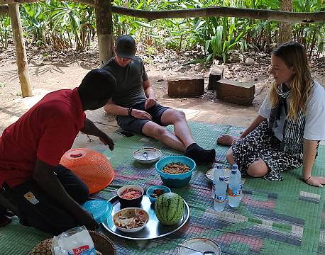 ”Sad under et halvtag på en måtte og spiste ris, fisk og diverse frugt. Høns og store kyllinger gik rundt i periferien og ventede på en godbid. Meget hyggeligt men ordet ”hygiejne” dukkede op i min bevidsthed flere gange.
