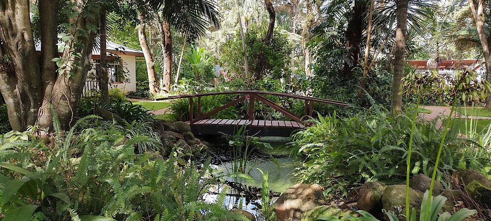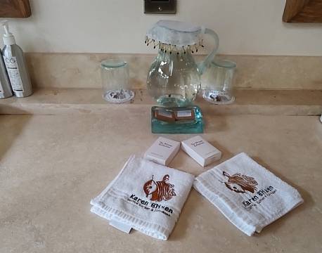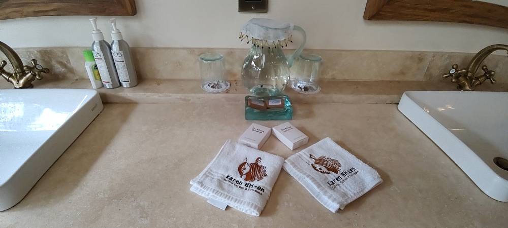 På grund af den heftige morgentrafik, kørte vi ad nogle mindre veje frem mod Karen Blixen Coffee Garden Cottages. Undervejs kørte vi langs hegnet til Nairobi National Park, hvor en håndfuld majestætiske giraffer gik rundt i landskabet.