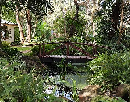 Kl. 14 var det tid til frokost. Fik Cesar Salad og vandmelonjuice, som blev indtaget i den udendørs restaurant med udsigt til både haven og swimmingpoolen.