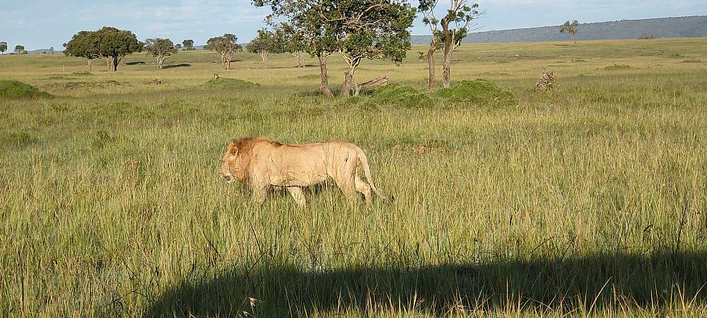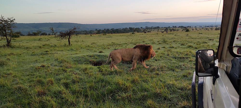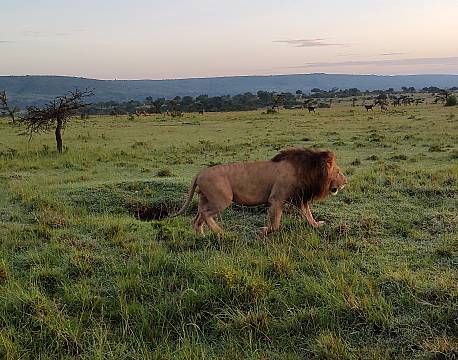 Kørte rundt og nød det smukke landskab. Fik efter nogen tid, hvor solen var kommet højere op på himlen, øje på en hanløve der kom gående i åbent terræn. Vi sad i bilen og så ham komme tættere og tættere på. Han gik lige forbi bilen uden at værdige os et blik.