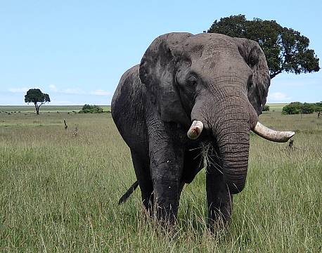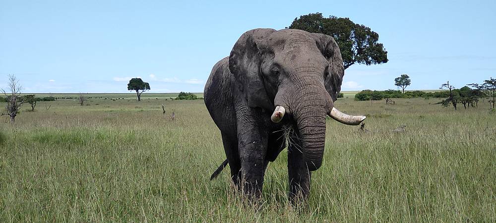 Sidste del af formiddagen bød på møde med to af de større dyr. Først fik vi øje på en flodhest, der var på vej op af et vandhul og dernæst to hanelefanter med imponerende store stødtænder. Den ene bar GPS-halsbånd og havde placeret sig i et område med meget blødt græs. Det var ifølge vores guide et tegn på at dens sjette og sidste sæt tænder var ved at være slidt ned.