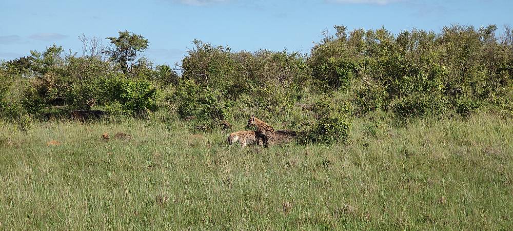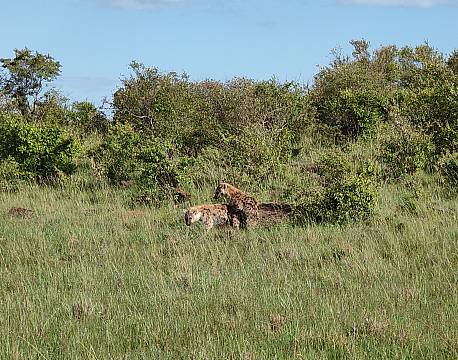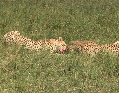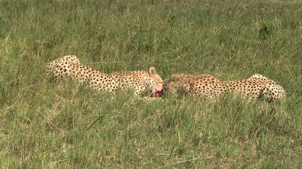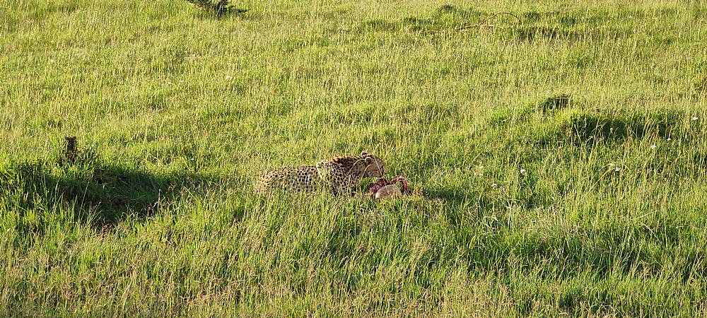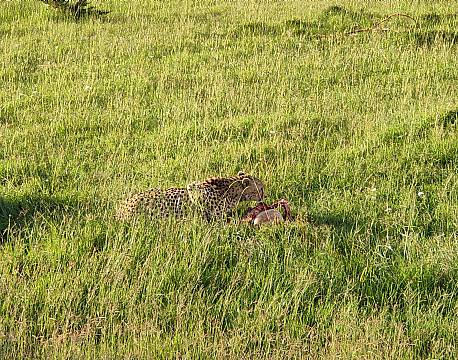 På afstand af hele sceneriet fulgte vi med i, hvordan geparderne fik nyt fokus i form af en Thompson gazelle med unge. Meget stor afstand. Utroligt. Moderen løb, men geparderne fulgte ikke efter hende. De havde nemlig spottet gazelleungen, der lå og trykkede sig i græsset. En jagt kan man måske næppe kalde det, men gazellens dage var talte. Et ungt liv var slut. Geparderne fik sig en snack og vi kørte hjem til meget sen frokost i campen.