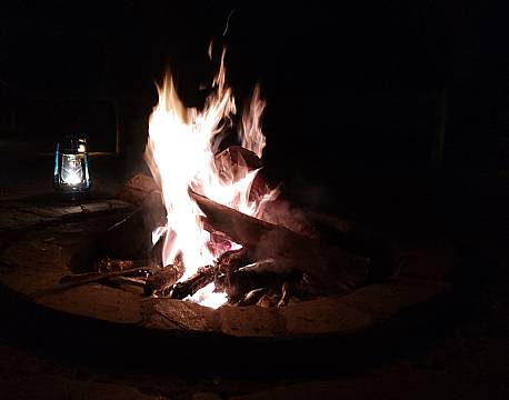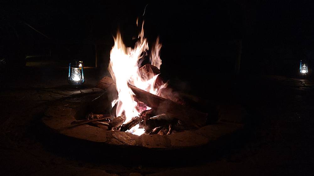 Da vi kom hjem til campen var der god gang i bålet foran restauranten. Satte os derfor og kiggede på de dansende flammer, mens vi nød en drink inden middagen.