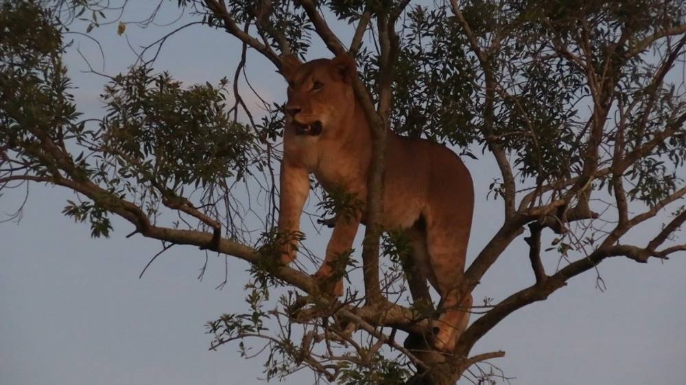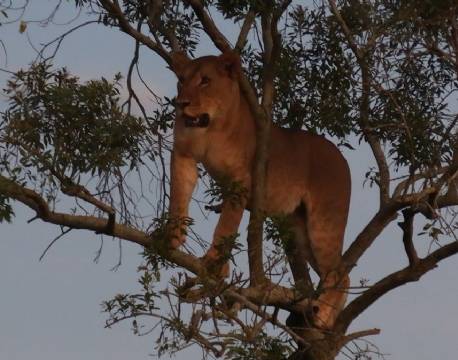 Sent på eftermiddagen kørte vi ud igen. Denne gang for at se løver. Fandt 4 hunner og en han. En af hunnerne kravlede noget usædvanligt op i et træ. En rigtig god udsigtspost, men hun havde alligevel sine betænkeligheder, da hun skulle ned igen. Hanløven sad nede på jorden og betragtede sceneriet. Lignede én der tænkte: ”Hvad har du gang i?”