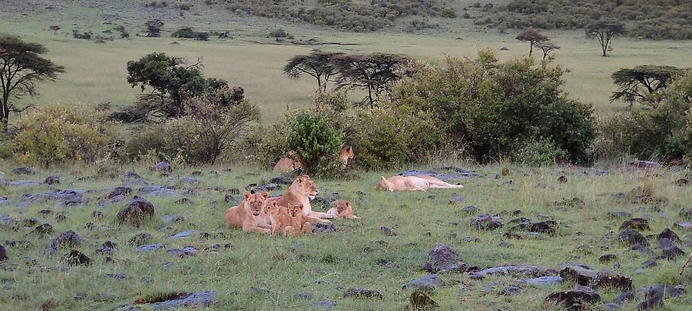 Eftermiddagen kom til at foregå i selskab med en masse løver i silende regn. Nogle af hannerne havde søgt ly for regnen i noget buskads. Unger og nogle af hunnerne havde søgt tilflugt under et akacietræ. Forgæves. Alle blev plaskvåde.