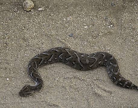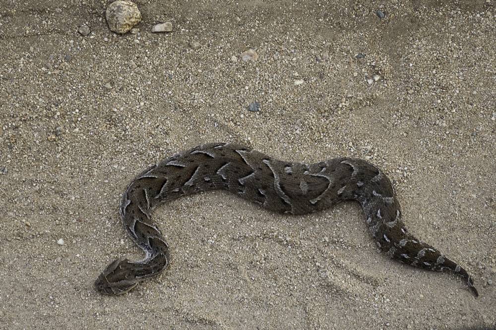På en tur til Balule i Sydafrika kunne vi fra safaribilen nyde synet af en puffadder, der lå midt på den sandede vej.