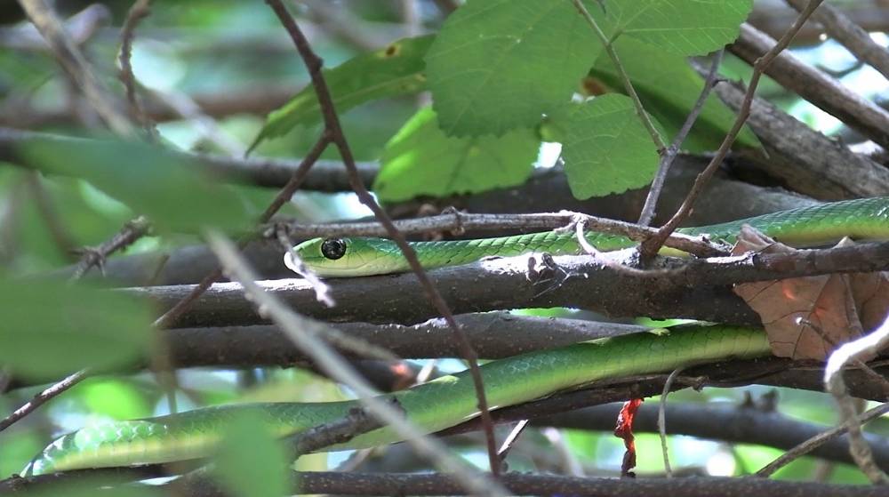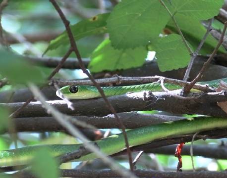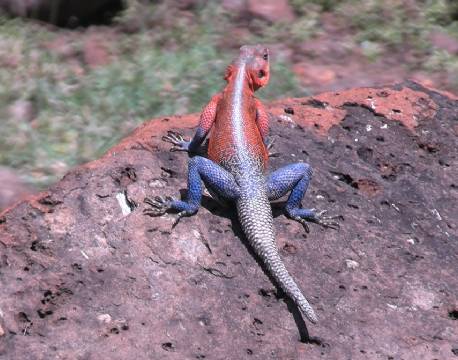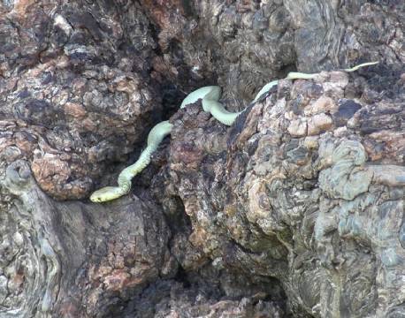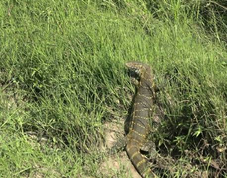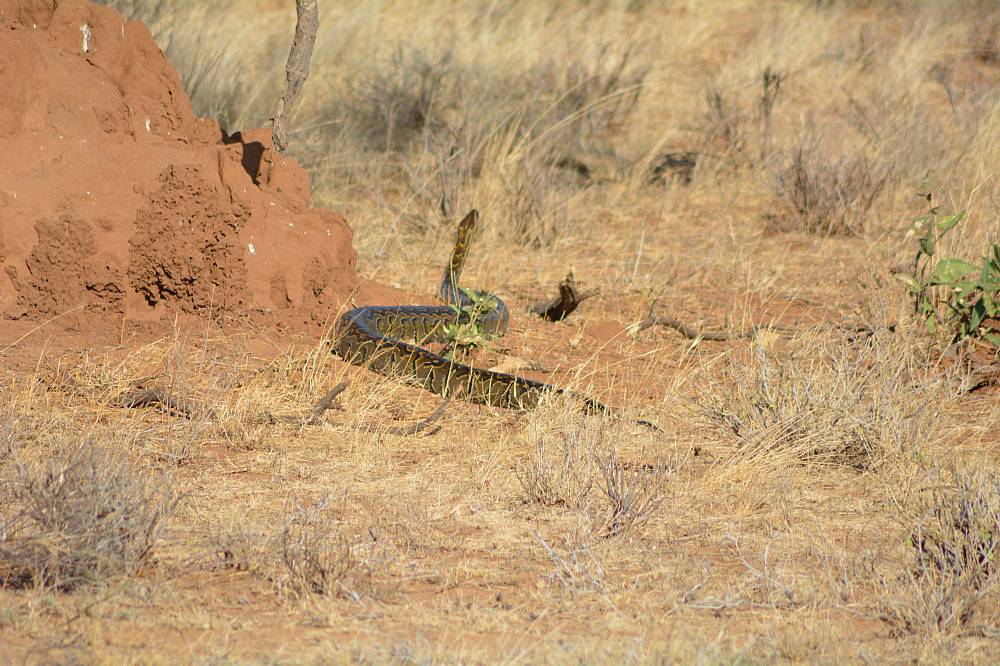 Slanger har jeg set ude på savannen fra en bil. Første gang var det min søn, der råbte ”stop, en slange” og pegede i retning af et rødt termitbo, der stak op i landskabet. Ganske rigtigt – en pyton bevægede sig langsomt hen over jorden for foden af termitboet. Anden gang fik vi øje på en del biler, der var samlet og tænkte, hvad mon de kigger på? Da vi kom derhen, viste det sig at der lå en pyton i græsset nærmest omringet af biler, så vi fortsatte kort efter med vores eget gamedrive.