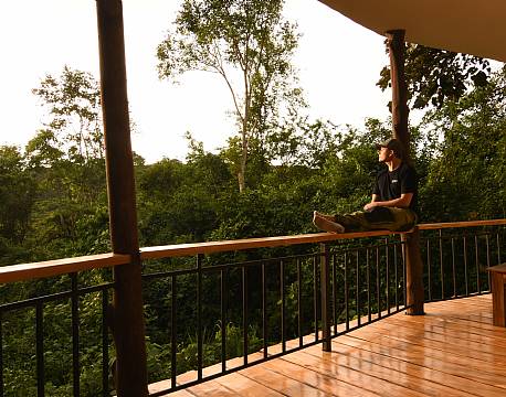 Fra den store balkon foran værelset kan man nyde udsigten til skoven og sidde og slappe af i en større sofagruppe, mens man lytter til alle fuglene. I klart vejr er der udsigt til Rwenzori Mountains (månebjergene) i baggrunden.