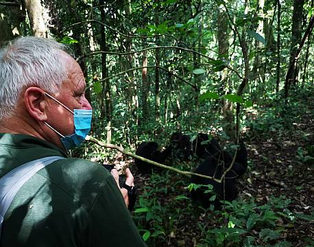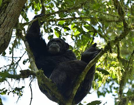 Chimpanserne farer afsted og vi følger efter men i et noget andet tempo. En god time senere havde vi fået kontakt igen. Dog flyttede chimpanserne hurtigt igen og vi måtte afsted på ny og prøve kræfter med de fugtige omgivelser. Således gik de næste par timer. Vi kampsvedte alle sammen, men havde ikke opgivet håbet om at få kontakt igen og få taget et par billeder. Det lykkedes også. Måske fordi chimpanserne ikke gad ”drille” os længere. Vi kom i hvert fald tæt på og fik nogle fantastiske oplevelser med vores nærmeste slægtninge på deres helt egen hjemmebane.