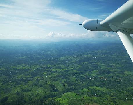 Stort set skyfrit hele vejen. En fantastisk udsigt til de grønne bakkede landskaber under os. Fra de ca. 3 km’s højde så man tydeligt veje, byer m.m. Da vi fløj hen over Mbamba swamp, fik jeg øje på det sted, vi sejlede ud fra på vores rejses anden dag for at lede efter træskonæb og kigge på fugle.
