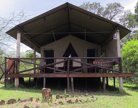 Fremme ved Karen Blixen Camp blev vi hjerteligt modtaget. Personale ventede med fugtige klude til at tage det værste rejsestøv og en kold velkomstdrink. Et dejligt gensyn for flere af os. For andre denne oplevelse af uvirkelighed, hvor man lige kniber sig selv i armen for at mærke, om det hele bare er en drøm. Gennem den halvåbne reception og restaurant kommer man ud på en græsplæne lige ned til Mara floden, hvor dyrene går på den anden side og flodhestene ligger og grynter ude i vandet.