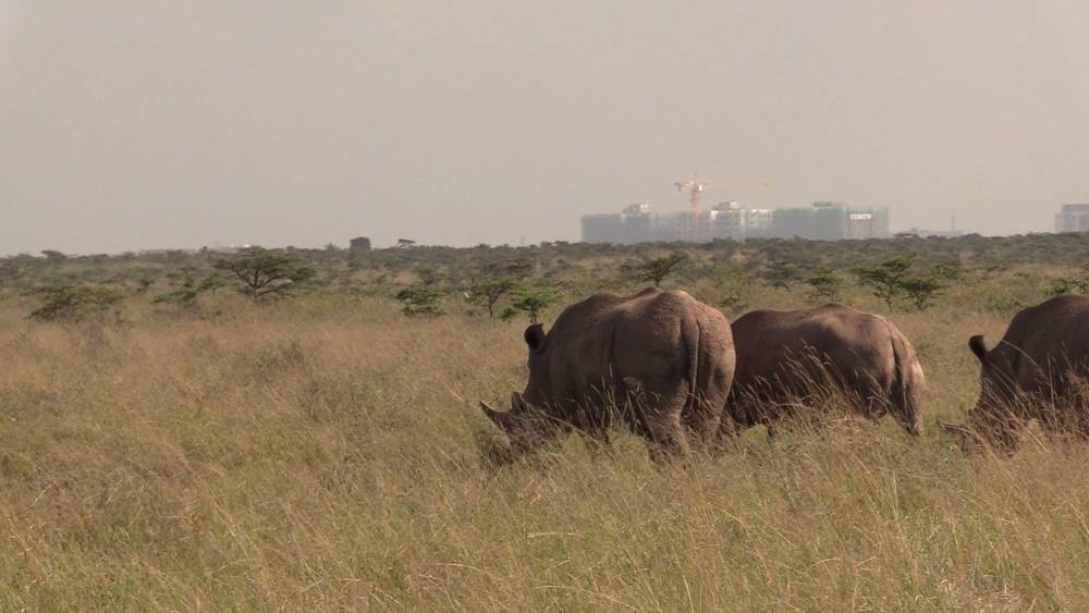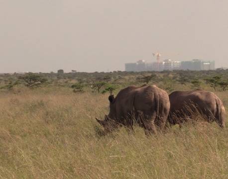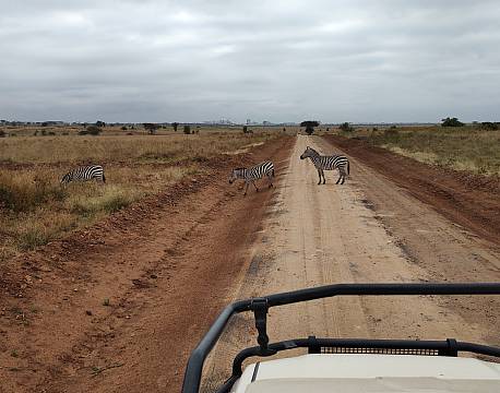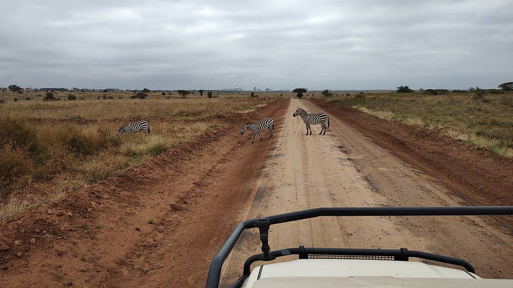 Når man kører rundt i parken, kan man se på vilde dyr med Nairobis skyline af højhuse som baggrund.