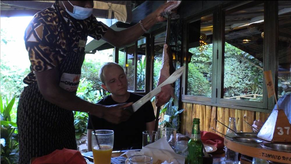 Under hovedretten tilbydes man mange forskellige slags kød, som bringes til bordet på store grillspyd og så skæres der en låns af, som lander på din tallerken. Af mere eksotiske ting har jeg smagt dromedar, krokodille og struds. Tilbehøret er lidt salat og en bagt kartoffel.