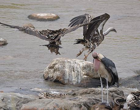 Når der skal ryddes op på savannen, er der både en hakkeorden og en ”arbejdsfordeling”. Lidt forenklet fortalt nedlægger de store katte et byttedyr. Mens de tager deres del, kommer hyæner, sjakaler, gribbe og marabustorke til. På et tidspunkt tager gribbe og marabustorke over. De største af gribbene kan fortære alt, andre – f.eks. hættegribben – har meget spidse næb og kan pille et skelet helt rent for kødrester. Gribbene omkring et ådsel ”jager” jævnligt med hinanden for at få de bedste bidder.