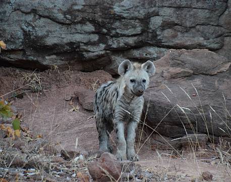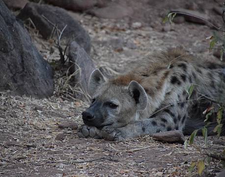 Når man kører på gamedrive om morgenen, møder man ofte omstrejfende hyæner, som er på vej hjem til hulen efter nattens jagt på føde. Hyænen har skarpe sanser både når det gælder syn, lugt og hørelse. Med sine skarpe tænder og kraftfulde kæber kan den knuse knogler og med en stærk mavesyre opløse de spiste knogler.