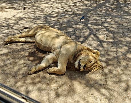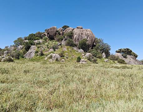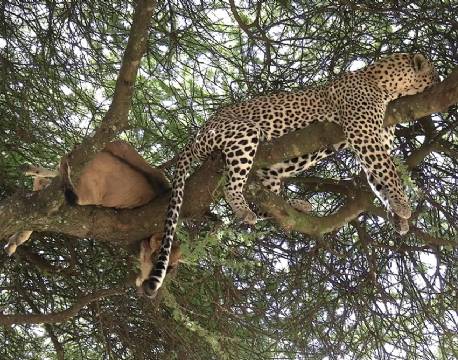 På en anden granitblok i nærheden lå der flere løver og tre store hanløver lå på jorden lige uden for bilen. Vi lavede en afstikker til et akacietræ, hvor der lå en leopard og sov til middag oppe i trækronen med en gnu ved siden af sig.