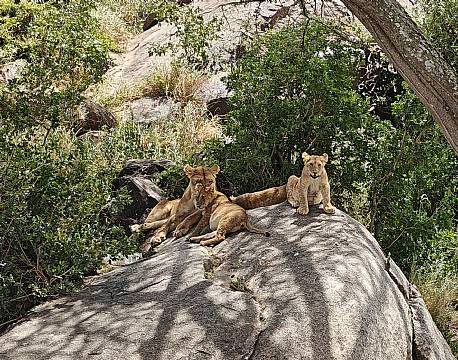 En af dagene tog vi lunch boxes med og kørte over i den østlige del af Serengeti. Vejen var ikke i god forfatning. På et tidspunkt da jeg med nød og næppe undgik at ryge ned fra sædet, da vi kørte hen over nogle store huller i vejen, sagde min chauffør/guide: ”Vejen til Himmerige kan være dårlig og hullet, men når man når frem…”. Det skulle vise sig at han fik ret. Da vi nåede frem, lå en større gruppe løver på toppen af en stor granitblok. Wow!