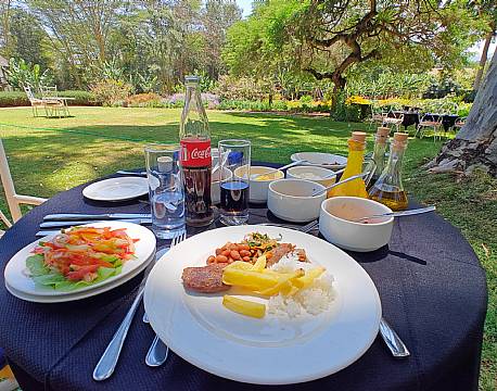 Efter afslapning og en god nats søvn gik jeg til morgenmad akkompagneret af fuglesang og solens varmende stråler. Noget af en kontrast til frostvejret og den kolde blæst, som jeg forlod hjemme i Danmark. Efter dejlig morgenmad var der lige tid til at tage trapperne op til et udsigtspunkt ved siden af swimmingpoolen. Wow, der stod bjerget. Nogle skyer og morgendis hang omkring bjerget, men det var synligt og jeg kunne se toppen.