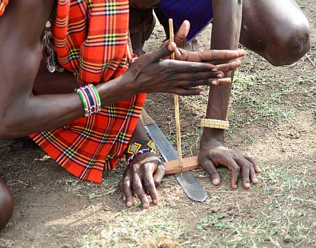 Opholdet i halvmørket og tilbage i fuld sollys er noget af en kontrast. Ude i det fri har nogle af de unge mænd gjort klar til at vise, hvordan de laver ild til bålet. Imponerende.