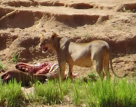 Udenfor vores terrasse oplever vi løver indfange dagens måltid, en Kudu, som de kæmper med at få spist inden snesevis af gribbe og marabustorke, dukker op fra himmelen og overtager resterne af ådslet.
