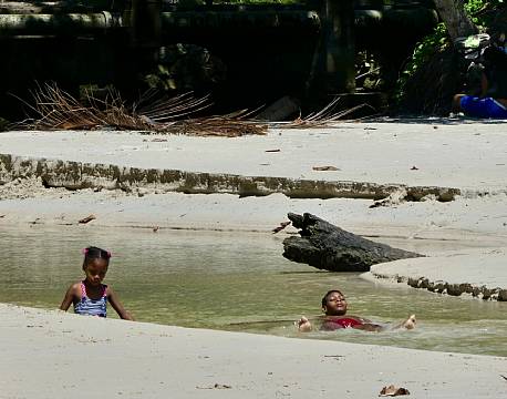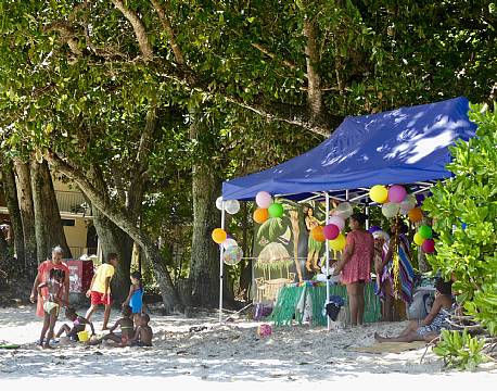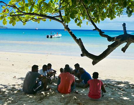 De lokale finder vej til stranden ligesom os turister. De finder skygge under et træ og får sig en sludder, griller og ungerne leger i vandet.