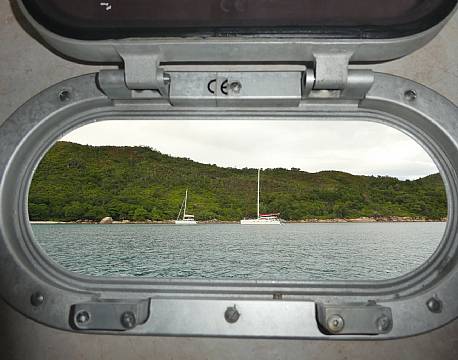 Vi har lagt anker for natten i bugten ved Anse Lazio sammen med 13 andre katamaraner og det eneste man hørte er havets stille klukken mod skibet - ellers stilhed.