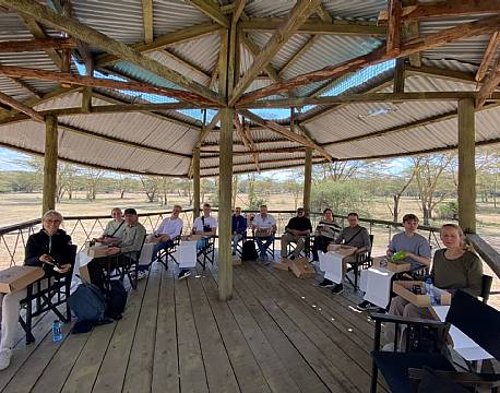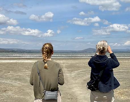 Medbragt frokost nydes i rondavelen med udsigt over Elementaita søen, hvor de lyserøde flamingoer ses.