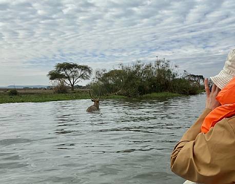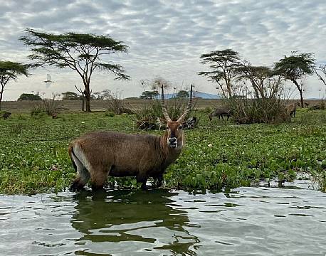Efterfølgende dag under vores sejltur på Naivasha-søen udspillede sig endnu et drama, hvor en smuk Waterbuck han havde fortrængt en konkurrent, der var flygtet ud i søen. Den fortrængte han svømmede for livet og kom i en lang bue tilbage til søbredden.