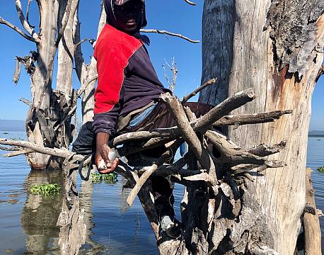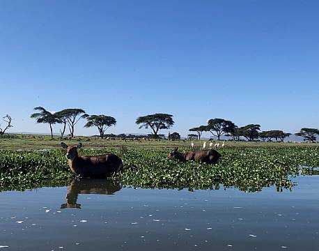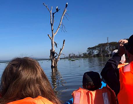 Sopa Lodge ved Naivasha søen var der rigtig mange zebraer helt oppe i haven, vandbukke i "vandet"  og på vores sejltur på søen mødte vi en fisker, som sad på en gren midt ude i søen