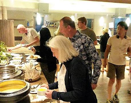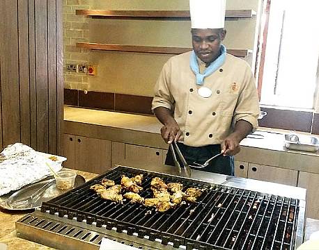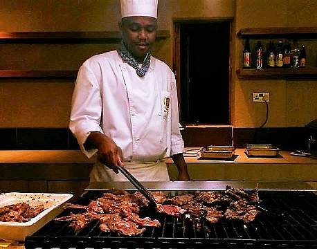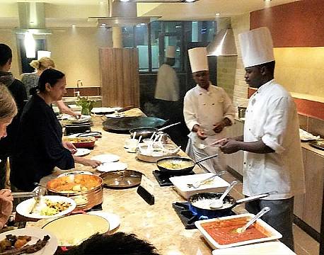 Her er det den helt nye buffetindretning på Ashnil Mara Lodge, hvor al maden bliver tilberedt mens gæsterne ser på.