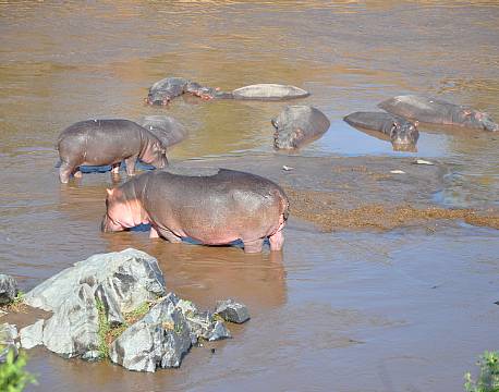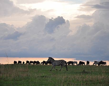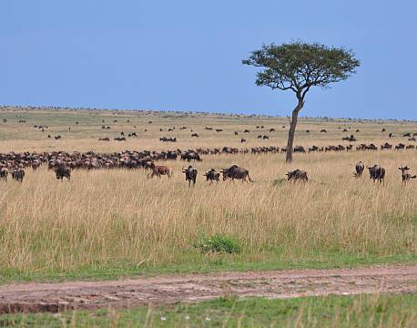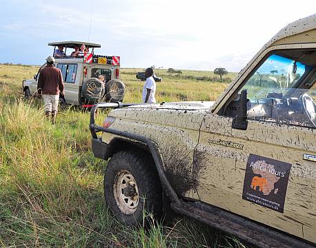 Masai Mara er grønt efter nye regnfald de sidste par uger, og gnuerne er stadig talrige. Vi var glade for de stærke firehjulstrukne Land Cruisere, som bragte os sikkert rundt overalt, ikke mindst i de mange steder mudrede spor i Masai Mara.