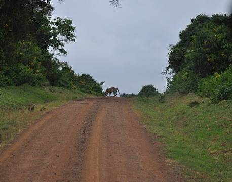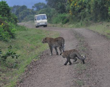 Leoparder er der i Aberdares National Park, og jeg har været heldig at få et par ultrakorte glimt af dem under tidligere ophold. Men bedst som vi havde lagt fra land og var ude på vejen, gik der to leoparder, en mor og dens unge, på vejen et stykke foran os.