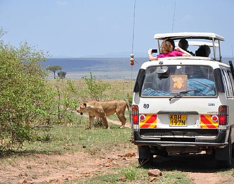 På en safari kommer vi meget tættere på dyrene end de fleste på forhånd forestiller sig. Som nu løvemor her, som har travlt med at holde øje med sine unger og slet ikke bekymrer sig om den underlige blikkasse på 4 hjul, som ikke udgør nogen trussel og ej heller noget bytte. Så længe vi holder os indenbords...