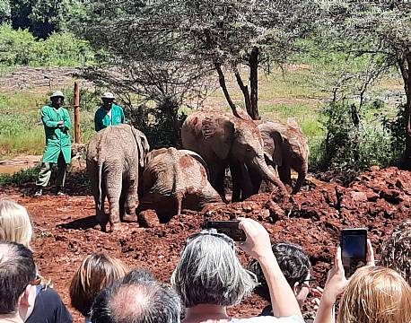 Vi besøgte "elefantbørnehjemmet" David Sheldrick's Elephant Orphanage, hvor vi så de moderløse elefantunger drikke specialfremstillet mælk af sutteflasker, rulle sig i mudder og lege, mens vi hørte om det fantastiske arbejde der udføres med at lokalisere og indfange dem, bringe dem på ret køl igen og genudsætte dem i den vilde natur hvor de efter 6-8 år ender med at blive indlemmet i vilde elefanters familieflokke.