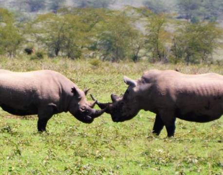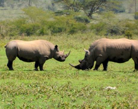 Sådan kom det ikke til at gå os. Efter ca. 15 minutters kørsel oplevede vi noget helt usædvanligt, da et sort næsehorn stod og prøvede kræfter med et hvidt næsehorn. De fortsatte med at teste hinandens styrke, indtil de bare var ca. 10 meter fra vore safaribiler.