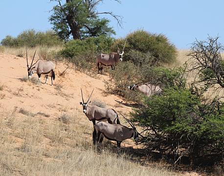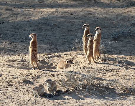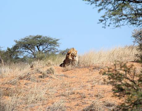 Herfra gik turen til Kalahariørkenen, der var noget mere dyrerig end Namibørkenen. Flere af de samme tørketolerante antiloper samt strudse, som vi havde set tidligere på turen, dominerede sammen med en del gnuer, mens to store hanløver der slikkede morgensol i de røde klitter efter en kølig nat nok var højdepunktet hér, måske sammen med en stor flok af de charmerende surikater.