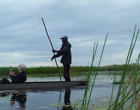 • Kanotur på Okavango deltaet med flodheste i baggrunden.