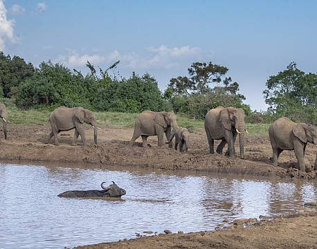 Frokosten blev afholdt på Aberdare Country Club, et meget dejligt sted, hvorefter vi tog den lokale minibus til The Ark, som lå 45 min kørsel højere oppe. Og da vi ankom til The Ark, ventede der et sjældent syn, som får hjertet til at slå en anelse hurtigere. Ca. 35 elefanter var på vej hen til vandhullet, som ligger helt tæt på selve lodgen.